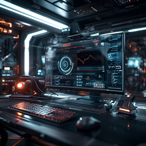 futuristic computer screen, computer screen showing a progressbar at 100%, futuristic room in background, realistic --v 6.0