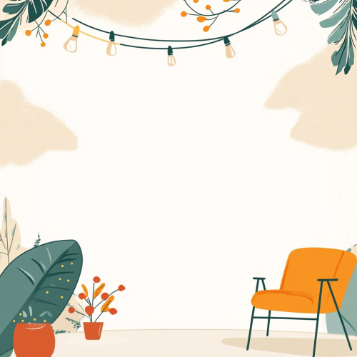 A minimalistic but cozy vector design, cartoon drawing in warm tones, a frame against a white background. Created Using: flat vector illustration, soft gradients, clean lines, minimalism but witchy, abstract clouds, cozy gamer vibes, twinkle lights, plants, witchy, modern technology, neon, professional graphic designer illustrated frame against white.