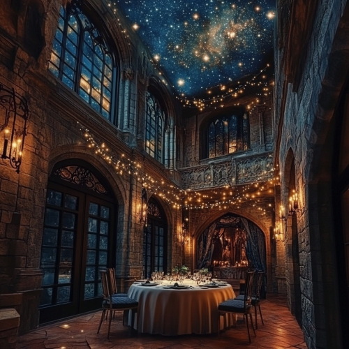 create a dinner scene in a castle atrium looking at the sky and you can see stars. It's a private dinner for two with twinkle lights inside the castle atrium, very romantic