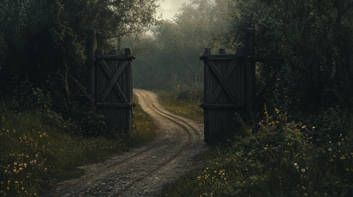 the gates of a wooden stockade block a narrow dirt road through thick wilderness, there are wagon tracks in the road, medieval setting, hyperrealism, --ar 16:9