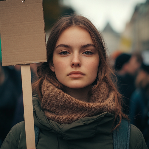 Attractive girl at a protest with a square sign attached to a stick cinematic poster of close-up in hyperrealism, cinematic maximal details photography, fashion, photorealistic --v 6.1
