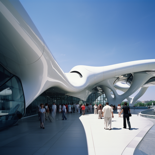 Photograph of a prupose built Cooling Centre designed by Zaha Hadid. The Cooling Centre is designed to reflect sunlight, absorb excess heat and keep the internal temperature cool. The Cooling Centre is an a city environment.