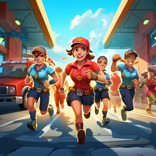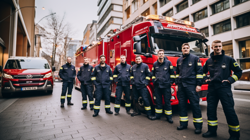 A group photo with members of the finnish fire department in red uniforms, police in dark blue uniforms, and EMT in high-viz jacket and red pants standing in front of a firetruck, police van and an ambulance parked in a line, hyper realistic, photograph, --ar 16:9