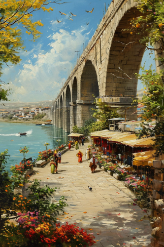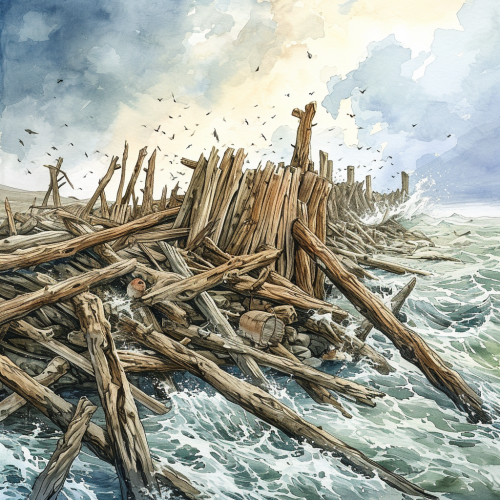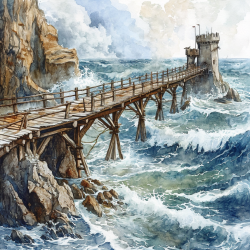 a giant beaver dam bridge as far as the eye can see across an ocean with turbulent waters, the bridge is made of driftwood and has lookouts and castle style features, realistic watercolor illustration, medieval times --v 6.0
