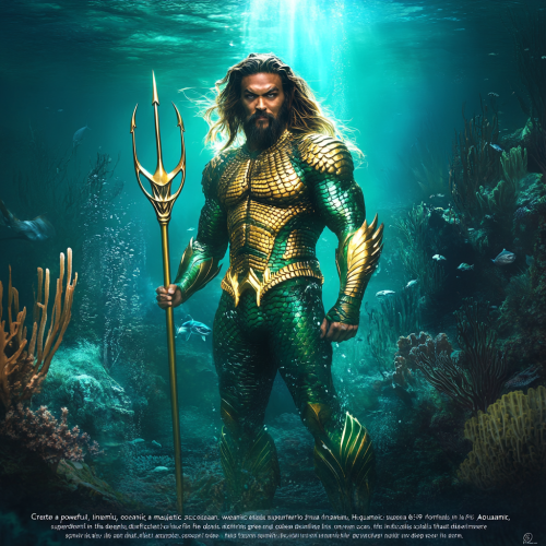 Create a powerful, cinematic image in a 16:9 format featuring a majestic, oceanic superhero inspired by Aquaman. He stands confidently in the depths of the ocean, wearing golden and green armor with intricate, scale-like details that reflect his deep connection to the sea. In one hand, he grips a glowing trident, pulsing with ancient, mystical energy. His long, flowing hair and beard move gently in the water, adding to his regal presence. Surrounding him is an underwater kingdom with towering coral structures and sea creatures swimming gracefully in the background. He stands firmly on a rocky seabed, water swirling around him as he exudes strength and authority. A faint, glowing aqua aura surrounds him, symbolizing his command over the ocean and all its creatures, as he looks ready to lead with wisdom and power as the king of Atlantis --ar 16:9