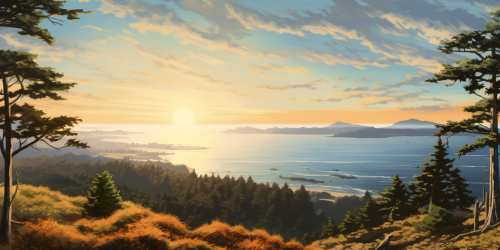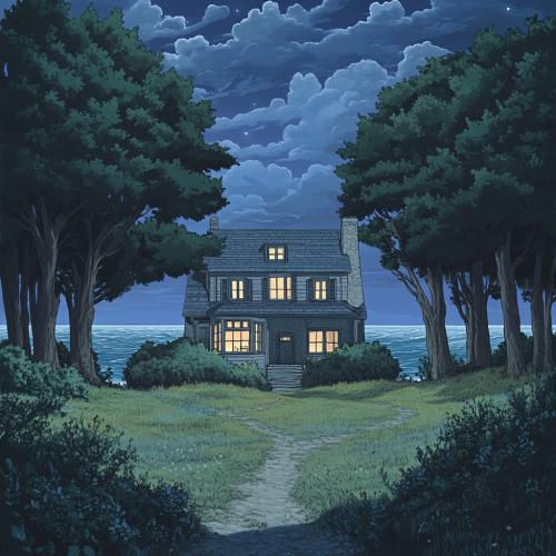 a large grey house with trees on either side and grass with the ocean being visible behind the house. Night. Studio Ghibli 2d anime art style. Fantasy themed. Ethereal. Romantic. Soft.