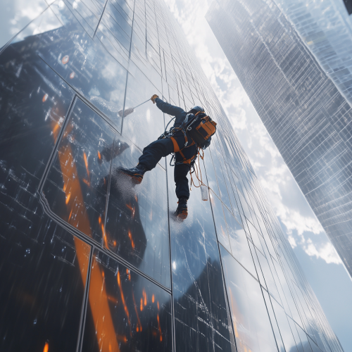 Create a realistic scene of a worker cleaning the glass facade of a modern office skyscraper using alpine techniques. The worker is suspended by ropes and harnesses, wearing safety gear, including a helmet and gloves, with tools like a squeegee and water spray bottle attached to his belt. The building has sleek, reflective glass panels and towering architecture, set against a bright sky that reflects on the glass. The perspective emphasizes the height and scale of the building, with the worker positioned halfway up, highlighting the meticulous and skilled work of facade maintenance