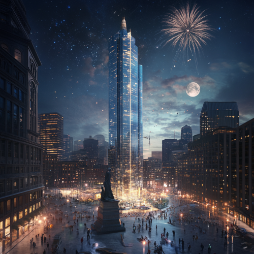 How does Boston look in the distant future, fascinating, 7000s, creative, realistic, photographic of Boston city, incredible, city square 3D rendering,city square 3D rendering, glass skyscraper, different perspective, Italian people, city lights, glass statue, fireworks, moon