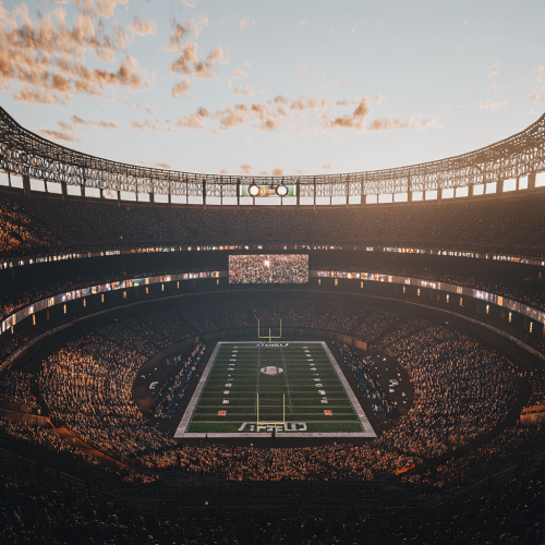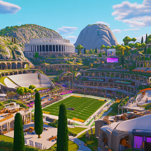 Roman colosseum reimagined as a modern NFL stadium, modern building materials, steel, glass, electronic billboards, no seats for fans, all spectators watch virtually like Zoom conferences, interior, early evening, rendered in style of Fortnite, - - ar 16:9