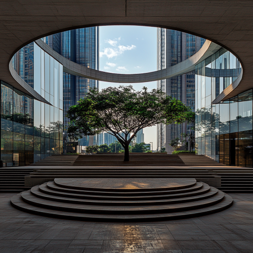 Roman inspired entrance tunnels at base of mountain, tunnels similar to modern NFL stadiums, building materials such as steel, white marble and glass, white granite walkways, 11 large tunnel entrances, all side by side in an inward semi circle, center tunnel is lined with white lights, the other tunnels are lined with individual colors, rendered in minimal visual noise graphic style, style of Robh Rupple