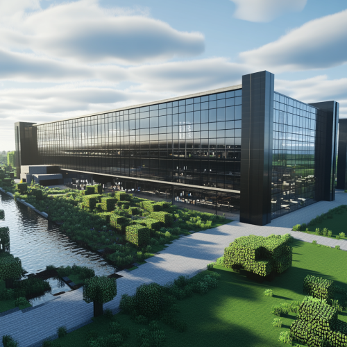 A large, modern industrial factory building with a strong, sleek structure made primarily of glass and steel. The interior features advanced technology and machinery, and the surroundings are clean with green spaces around the building.