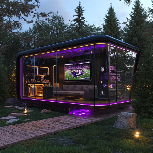 extra large modern camper pods, rectangular in shape, made of glass and steel, interior is a sports man cave bar, couch, big screen TV with football game, Minnesota Vikings themed, purple colored lights, large wrap around deck, big lawn, fir trees, spruce trees, walkways made of brick, small electronic billboard on front lawn with Madden icons,early evening, stylized,rendered in style of Fortnite, - - 4:3