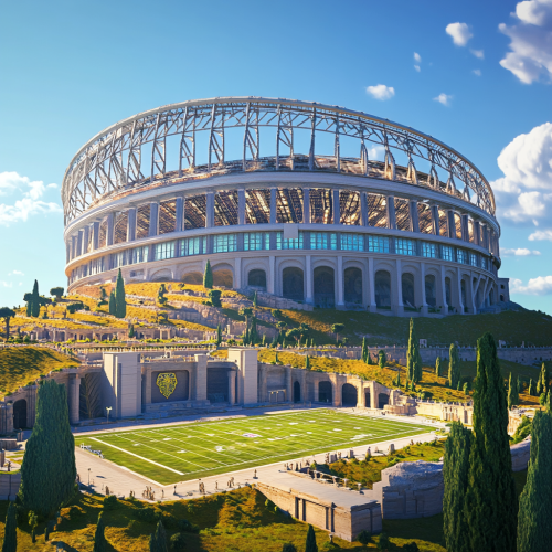Roman colosseum reimagined as a modern NFL stadium, modern building materials, steel, glass, exterior, area in front of entrance, Roman gardens, rendered in style of fortnite