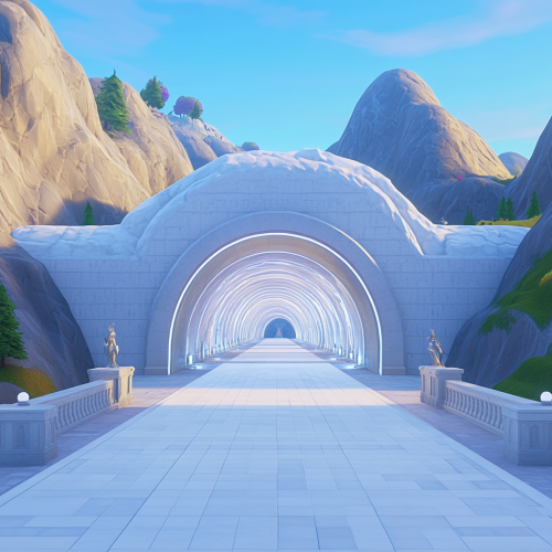 Roman inspired entance tunnels at base of mountain, building materials such as steel, white marble and glass, roman landscaping, white granite walkways, 11 large tunnel entrances, center tunnel is lined with white lights, the other tunnels are lined with individual colors, rendered in minimal visual noise graphic style, style of fortnite