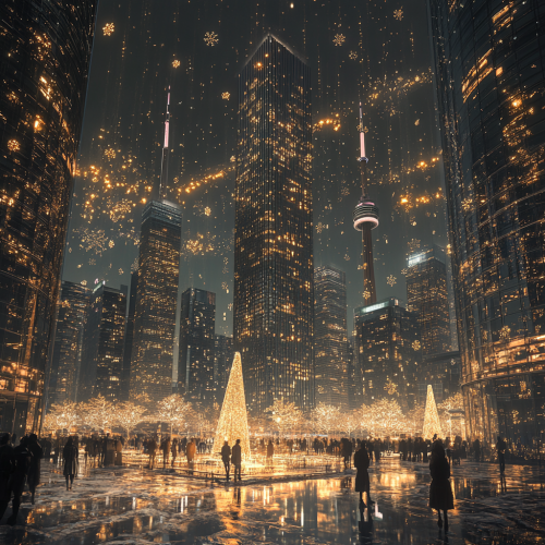 How does Toronto look in the distant future, fascinating, 7000s, creative, realistic, photographic of Toronto city, incredible, city city square 3D rendering, glass skyscraper, different perspective, different perspective, Canadian people, city lights, golden crystalline snowflakes, winter, glass statue, night