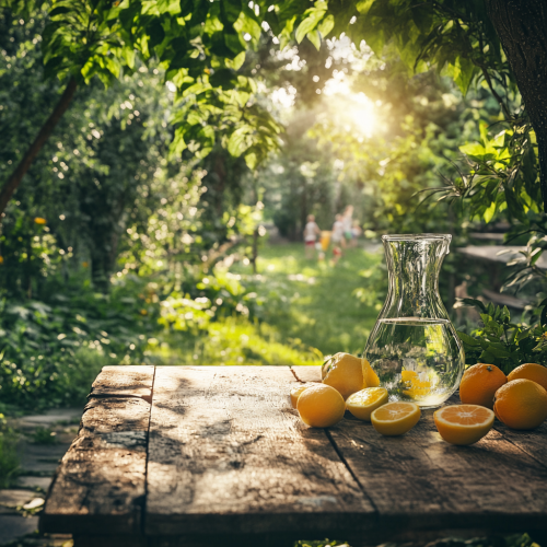 A rustic garden table in a bright, sunny garden, with a clear glass carafe filled with water placed on the right side of the table. Sunlight beams through the carafe, creating a sparkling effect, drawing attention to its refreshing content. Scattered on the table are a few fruits like oranges and lemons, keeping the scene minimalistic. In the background, a lush green garden, with children playing in the distance, evoking a joyful, carefree summer day. The mood is vibrant, inviting, and thirst-quenching, with a gentle breeze and warm sunlight filling the scene photorealistic, expansive background, natural lighting, high detail --v 6.1
