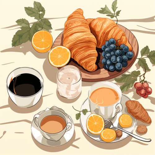 flatlay of table with coffee, fruits, croissants and water glass in digital illustration style and neutral colour tones
