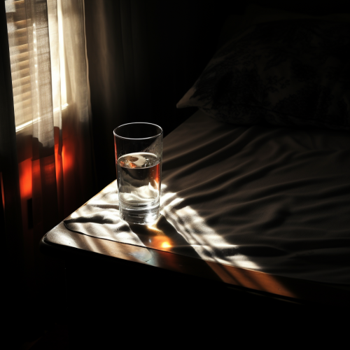 A rustic garden table in a bright, sunny garden, with a clear glass carafe filled with water as the central focus. Sunlight beautifully shines through the carafe, creating a glistening effect that enhances the refreshing atmosphere. On the table, a few scattered fruits like oranges and lemons, but minimalistic so that the attention remains on the carafe. In the background, blurry silhouettes of children playing, evoking a sense of joy and carefree summer days. The overall mood is light, fresh, and relaxing, with a soft breeze and warm sunlight. The scene invites a sense of thirst and relaxation photorealistic, natural lighting, high detail --ar 16:9 --v 5.0