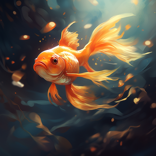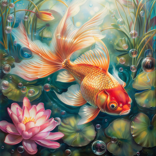 A cute goldfish swimming gracefully in a crystal clear pond, surrounded by vibrant water lilies and delicate bubbles --chaos 5