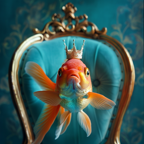 a goldfish sitting on a throne with a crown on its head. it points directly at the camera