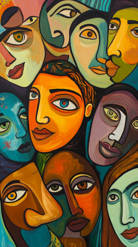 The figure moving forward with a group of people, all faces determined and united in a community center facial expression: a look of solidarity and shared purpose, eyes bright with connection, lips curved in a small smile style: Vincent Van Gogh, perspective: medium close, afternoon, colors: warm oranges, soft greens, and vibrant blues, background: a familiar community center setting with people working together, stacking books in a library, or volunteering, with a feeling of unity and purpose. --ar 9:16