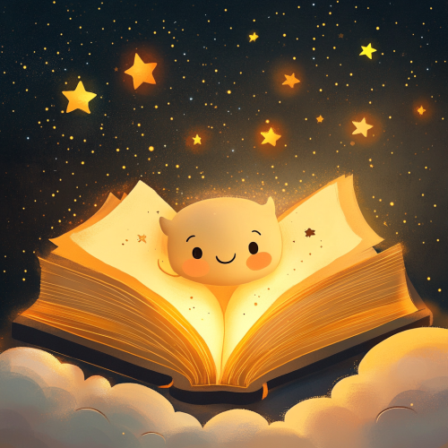 An illustrated book glowing with warm, golden light, open in front of a curious character, joyful expression, cartoon style, colorful and inviting, simple details for children, background with stars and soft clouds