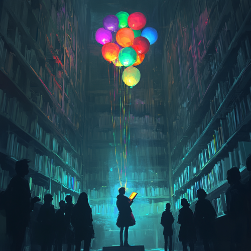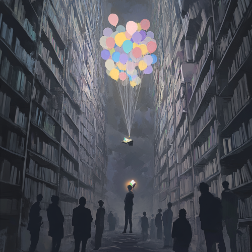 A towering, dimly lit library with high shelves, everything in muted grey tones. Hundreds of sad students stand on the ground below, each holding a grey book. The atmosphere is heavy and somber, with the students blending into the dull, colorless surroundings. Above them, one student floats in the air, tied to bright, glowing, colorful balloons, holding a bright, glowing, vibrant book.