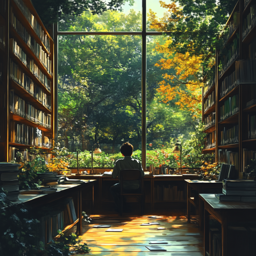 an anime style drawing of a student studying with his back to us in a library at the side of a long table. His view is to the outside green space with realistic lighting coming in from the evening sun. --s 750 --q 0.5