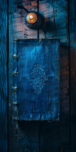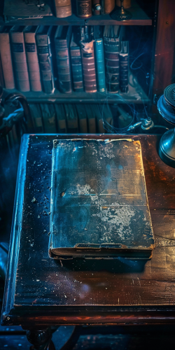 Antique old book, from directly above, front, close-up of book on large antique desk, little antique lamp light, very dark room, blue light, library in background --ar 1:2 --style raw --v 6.0