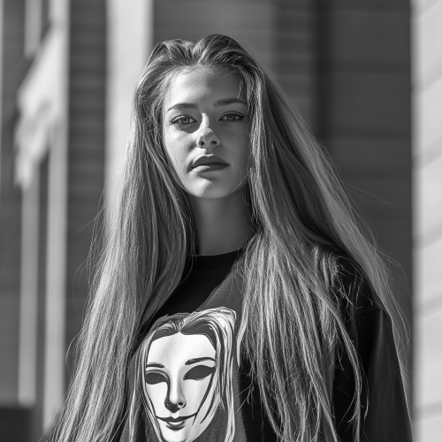 "A real photo, not comic, of a confident and arrogant university student superhero known as 'Trickster,' with the power to deceive and lie. She has long, flowing hair and wears a sleek, stylish outfit. She stands with a proud, mischievous grin, wearing a shirt of a mask symbolizing her deceptive nature. The mask features two faces--one smiling and one frowning--representing her ability to manipulate emotions and situations. Her posture is defiant and self-assured, as if she's always one step ahead of everyone else. The background shows a university campus, but Trickster's focus is entirely on herself, exuding ego and trickery.
