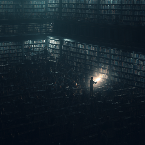 A dark library which is huge and goes on forever with millions of students sitting at tables in it all reading books. The colors are dark and muted. However, one student has a bright book that is glowing brightly and he appears confident and wears glasses.