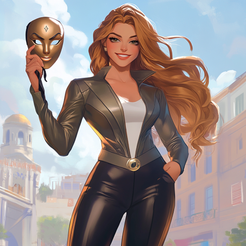 A confident and arrogant university student superhero known as 'Trickster,' with the power to deceive and lie. She has long, flowing hair and wears a sleek, stylish outfit. She stands with a proud, mischievous grin, holding a mask in one hand, symbolizing her deceptive nature. The mask features two faces--one smiling and one frowning--representing her ability to manipulate emotions and situations. Her posture is defiant and self-assured, as if she's always one step ahead of everyone else. The background shows a university campus, but Trickster's focus is entirely on herself, exuding ego and trickery.