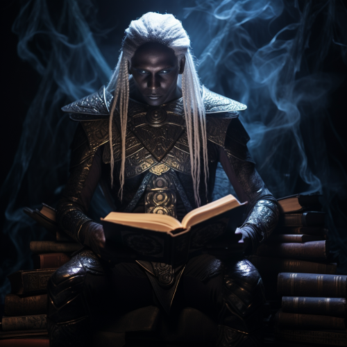 dark drow dark elf with long faux white locs & glowing eyes reads on an obsidian thrones of books.