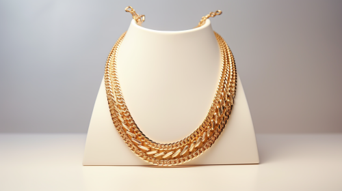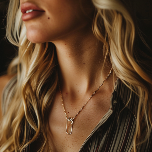 Medium close-up of a blonde woman wearing a gold paperclip necklace, elegant simplicity, high detail, Canon EOS R5, high-quality lens, soft, harmonious light