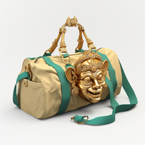 Detailed, Cambodian hanuman mask on a baby, sitting, gold necklace, gold bracelet, duffle bag, full of cash, behind, smoking, 3D, cartoon style