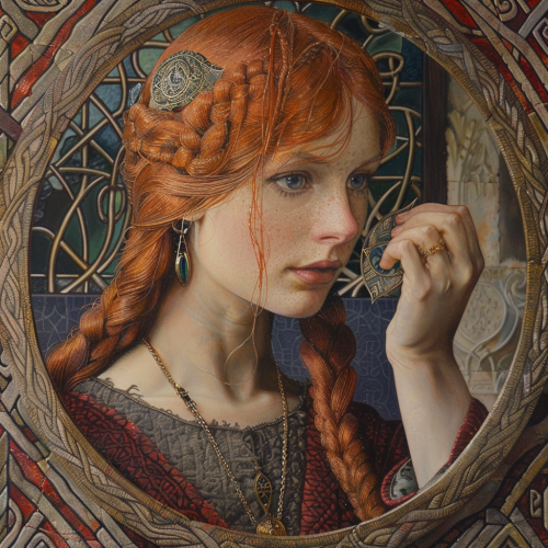 Depict the scene in early medieval style: Eleanor May Tomlinson braided her red hair, clasped it on top of her head with a gold clasp, and put her good gold brooch into the fold of her cloak and her moonstone necklace.. She looked at herself in the old bronze mirror inside her early medieval adorned chambers in Tintagel