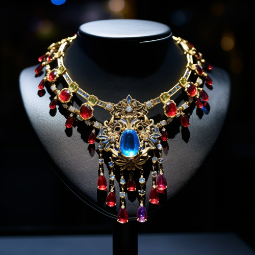 A heavily jeweled thick necklace on a black display stand, fine gold weave, ruby, saphire, opal
