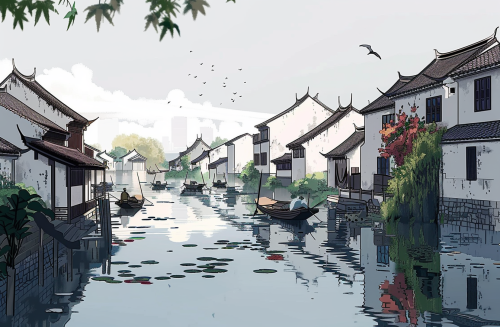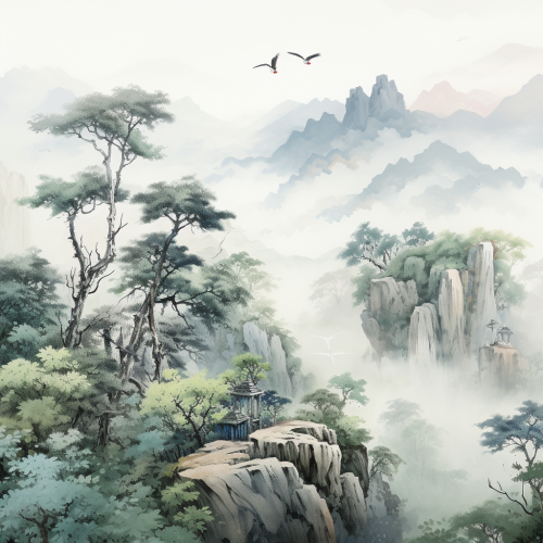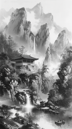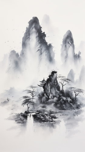 [5a3dbc73b] Chinese painting, ink splashed landscape painting. There are mountains, water, and people. --v 5.2 --ar 9:16 --c 0
