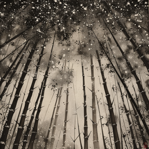 A landscape of a bamboo forest with white snow falling, viewed from below, dark bamboo stalks against a light snow-filled sky. Traditional Chinese ink painting techniques, with variations in bamboo density and snowfall intensity, high contrast, subtle gradations of ink wash for depth, serene atmosphere. Created Using: hand-ground ink sticks,
