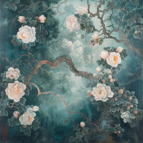 Design a serene and mystical poster in the style of traditional Chinese ink and wash painting, emphasizing flowing, elegant brushstrokes and a harmonious composition. The central figure is a fluffy, elegant white cat with a refined and graceful expression, nestled within soft, swirling clouds. The cat’s fur should blend naturally with the clouds, creating a seamless, airy effect. Adorn the cat with delicate gemstone beads, subtly incorporated into its fur, around its neck, or as a gentle headpiece. The beads should be eye-catching yet harmoniously integrated, adding a touch of elegance and luxury without disrupting the overall balance. The background should feature a soft, light green wash, enhancing the tranquil and otherworldly atmosphere. Include traditional Chinese spiritual motifs, such as lotus flowers or intricate cloud patterns, using fine, fluid lines to maintain the sense of harmony and immortality. The entire image should evoke calm, elegance, and mystical beauty, perfectly aligning with the theme of a gemstone beads jewelry online shop.