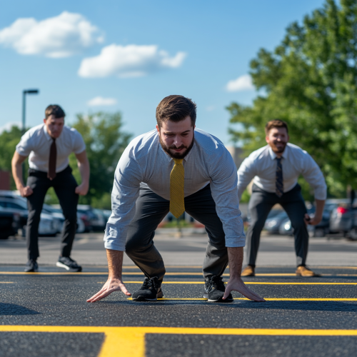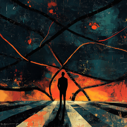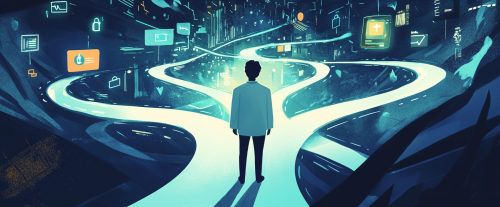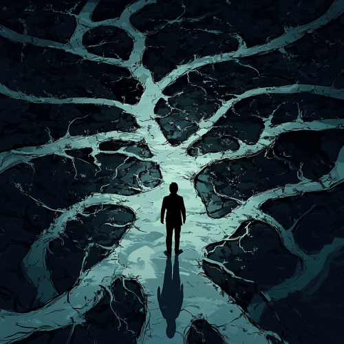 Generate a digital art for A digital art scene showing a professional standing at a crossroads with multiple career paths branching out, symbolizing career pivots and opportunities across various industries. The background should be in shades of black. --ar 1:1