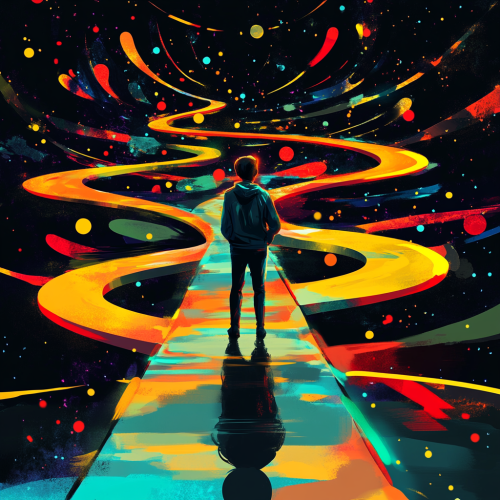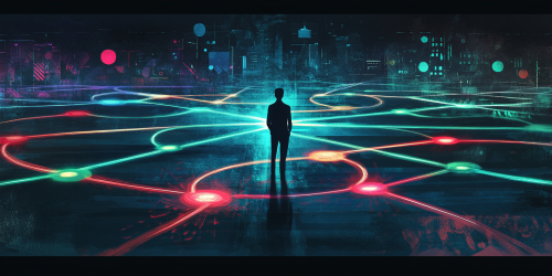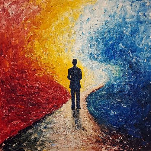 Generate a digital art for A digital art scene depicting a professional standing at a crossroads with various career paths branching out, each path symbolizing different programming skills. The background should be dark with shades of black and grey, while the paths are illuminated with vibrant colors like blue, green, and red to signify opportunities. The professional should look confident and ready to take on new challenges. --ar 2:1