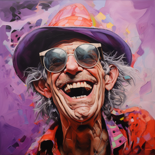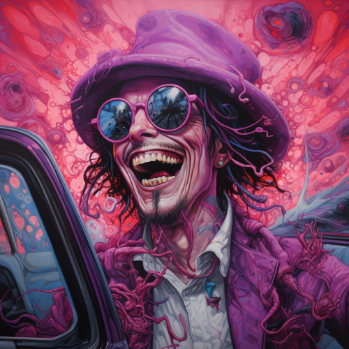 a goofy, silly, funny, cute, happy, laughing johnny depp character wearing goggles and a big vagabond fedora hat, selling his soul to the devil at the crossroads, pink, purple, rockstar skinny jeans, van gogh paintings, huncho jack jack huncho album artwork, tim burton, travis scott astroworld, ralph steadman, ultra detailed, oil painting, 8k