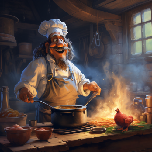 Disney's character Goofy cooking in a rustic style kitchen with The Muppet's Swedish Chef. detailed sketch
