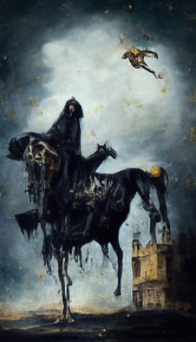 dark hooded figure on skeleton horse Rearing up on his hind legs in front of a broken decaying castle ::1 death on a horse dripping with black oil, Francisco Goya style, Albert Dürer style, Black and gold Sparkling particles floating in the sky like black flakes of ash, Hyper realistic, --ar 9:16 --v 3