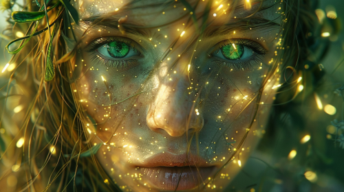 Generate a hyper-realistic photograph of a forest nymph with skin that has the soft glow of fireflies, her hair a vibrant green that mimics the leaves of ancient trees. She is adorned with flowers that emit a natural, ethereal light, illuminating the enchanted grove around her. Her eyes hold the depth of the forest, and her presence is as commanding as it is mysterious, drawing in those who dare to wander her sacred woods. In the style of documentary photography --ar 16:9 --style raw --v 6.0 --s 500