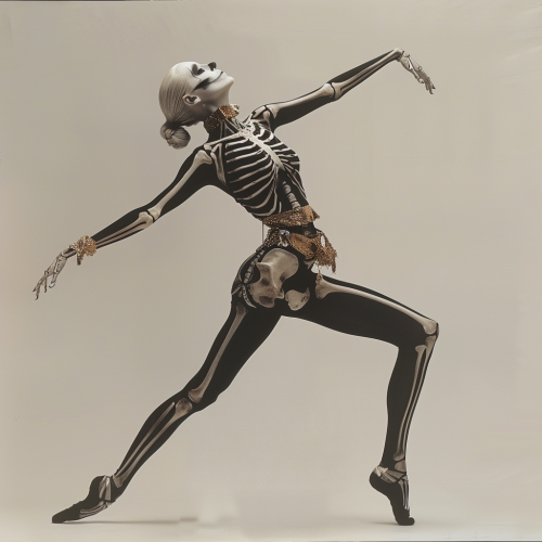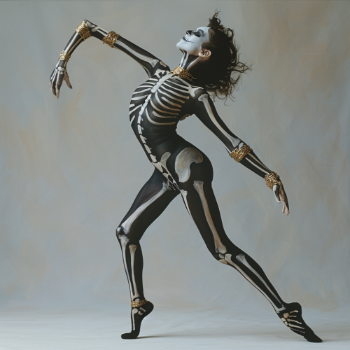 richard avedon style ultra realistic full-body image 2:3, strong shadow and light contrast, low angle hasselblad photo realistic image, dynamic shot of gothic punk ballerina dancing, smoky make up, wearing a skeleton bodysuit, choker, golden bracelet, acrobatic dance on empty floor, slow motion, dynamic posture and expression. capturing a moment of agility and movement. ray tracing, subsurface scattering, masterpiece, strong gold hue, matte textures, low saturation, perfect face, — ar 2:3 --v 6.0 --s 250