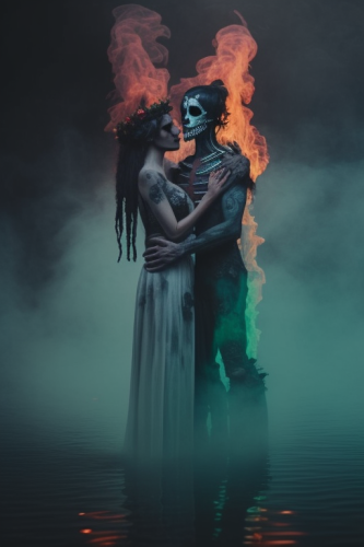 full body, gothic skeleton headed nymph and handsome ghost prince, fire and water in the background, roses, loving embrace, creepy, scary, gothic tattooed woman, studio lighting, in the style of Peter Lindbergh, fog, mist, moonlight, splash of color, 4k --chaos 5 --ar 2:3 --stylize 50 --v 4