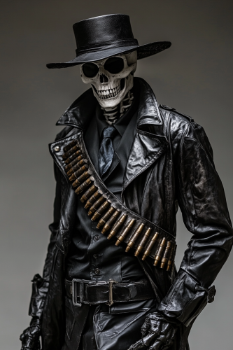 A black T-shirt design with a large, eye-catching design on the front. The centerpiece is a detailed and stylized skeleton, drawn in a slightly cartoonish yet still eerie manner. The skeleton giving off a relaxed, laid-back vibe. In one hand, the skeleton holds up a glass of bourbon, filled with a rich amber liquid that catches the light, reflecting a warm glow. The glass is slightly tilted as if the skeleton is mid-toast, celebrating Halloween with a spooky cheer. The other hand rests on the arm of the chair or perhaps holds a small pumpkin or another Halloween-themed item, like a cigar or a small ghost. Around the skeleton, there are subtle Halloween elements like faint, shadowy bats flying in the background, a crescent moon, and some scattered autumn leaves at the base, giving the scene a seasonal touch. Above the skeleton, in a gothic-style font, the words "Stay Spooky" are arched in a semi-circle. Below, in smaller text, it might say something like "Raising Spirits Since Forever" as a playful nod to the bourbon and the spooky theme. The overall color scheme could include shades of black, white, and gray for the skeleton, with warm tones for the bourbon and subtle pops of orange or red for the leaves and other details. The design balances a sense of fun with just the right amount of Halloween spookiness, making it a perfect shirt for the season. --v 6.0