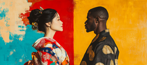 An abstract, vibrant banner image featuring two individuals from different cultural backgrounds (a japanese woman in a kimono and an african man both wearing cultural outfits) standing on opposite sides, facing one another in the style of Barkley L. Hendricks --ar 9:4